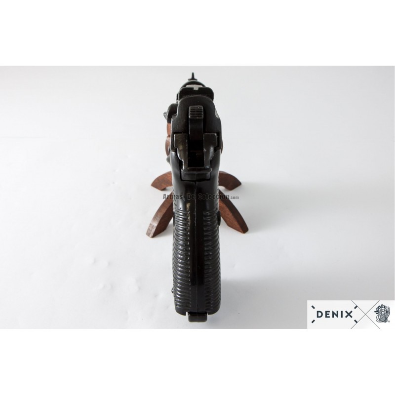 Descubre la réplica de la Walther P38, un verdadero símbolo de la ingeniería militar alemana de mediados del siglo XX. Esta pieza, fabricada por Denix con la referencia 1081, es una fiel reproducción de la pistola semiautomática que fue estándar en el armamento de la Wehrmacht durante la Segunda Guerra Mundial.