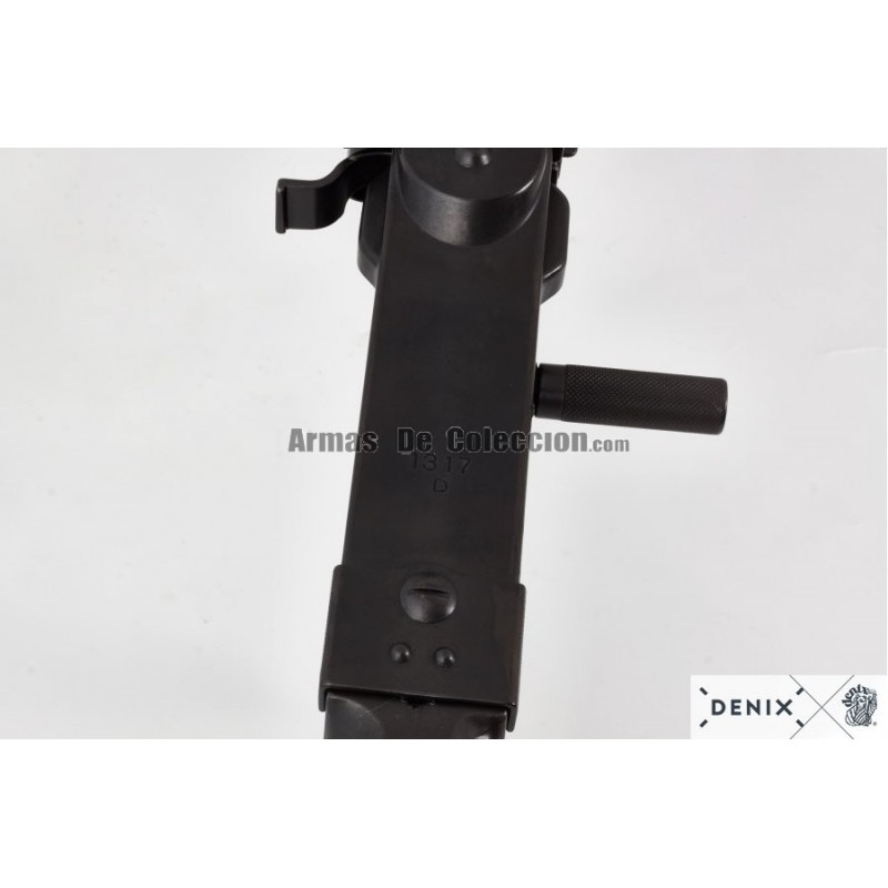 Fabricada con metal, madera y polímeros, esta imitación incluye un bípode móvil, cargador fijo, y mecanismos externos simulados de carga y disparo. Con 122 cm de longitud y 6,94 kg de peso, refleja con precisión las dimensiones del modelo real. Su acabado robusto y su impresionante presencia visual la convierten en una pieza imprescindible para coleccionistas y recreadores históricos.