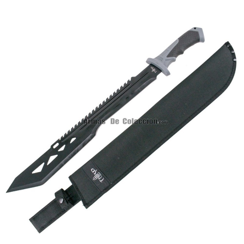 Machete cortacañas, hoja de acero inox acabado negro de 64,2 cm con mango de ABS de doble inyección negro y gris, con funda de nylon.