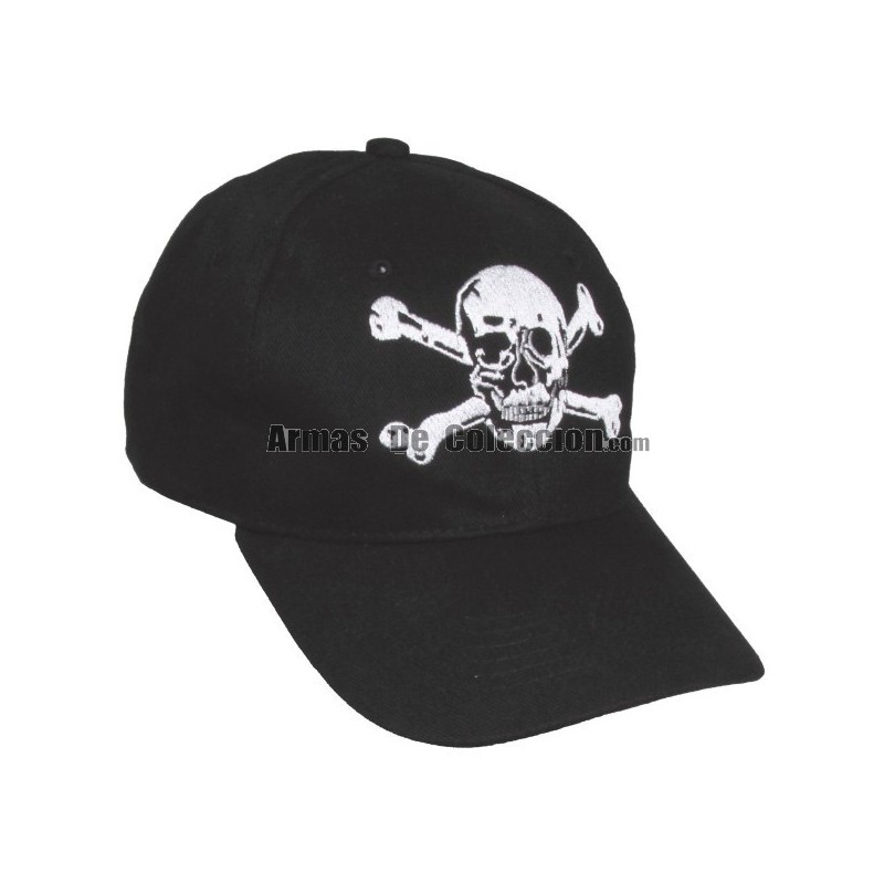 1 Gorra Pirata Negra con bordado frontal de calavera y huesos cruzados.