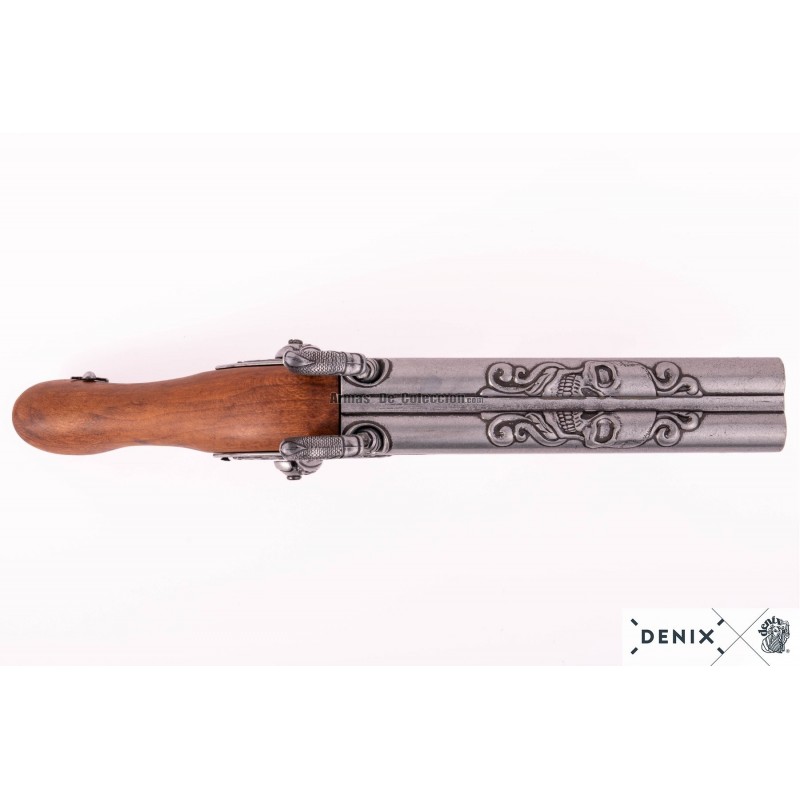 Réplica decorativa de pistola de la época S.XVIII inspirada en las armas piratas históricas. Construida en metal y madera, destaca por su doble cañón y los ricos acabados ornamentales: motivos de calaveras, remates en forma de dragón en el martillo y pequeños apliques metálicos en la culata. Un objeto perfecto para coleccionistas, escenografía, decoración temática o como pieza de exposición.