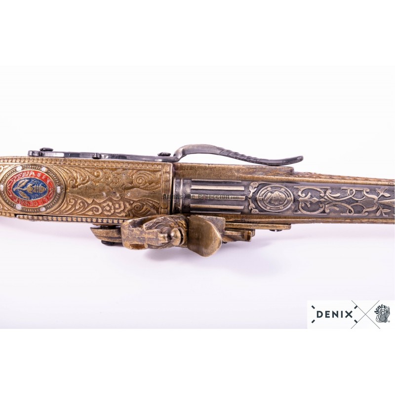 Imitación de una pistola de chispa escocesa de 1760, cuidadosamente reproducida por Denix con un alto nivel de detalle.