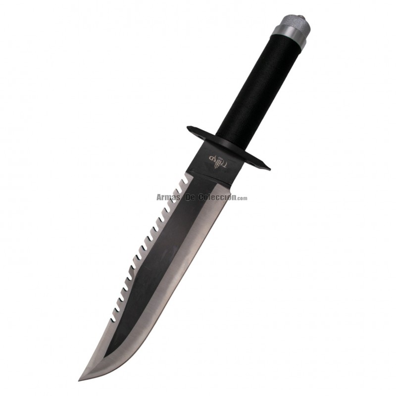 El mango encordado en paracord negro proporciona un agarre seguro incluso con humedad o manos enguantadas, además de ofrecer una estética táctica y funcional. Sus 14,7 cm permiten un control firme del cuchillo pese a su tamaño total de 39,7 cm. Con un peso de 583 gramos, este modelo transmite sólida presencia y estabilidad en cada movimiento.