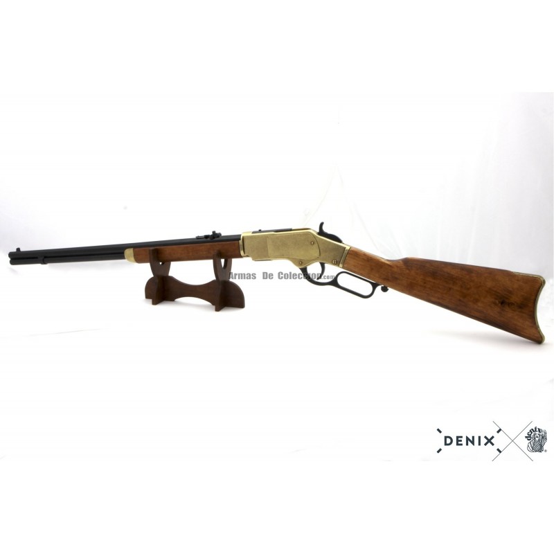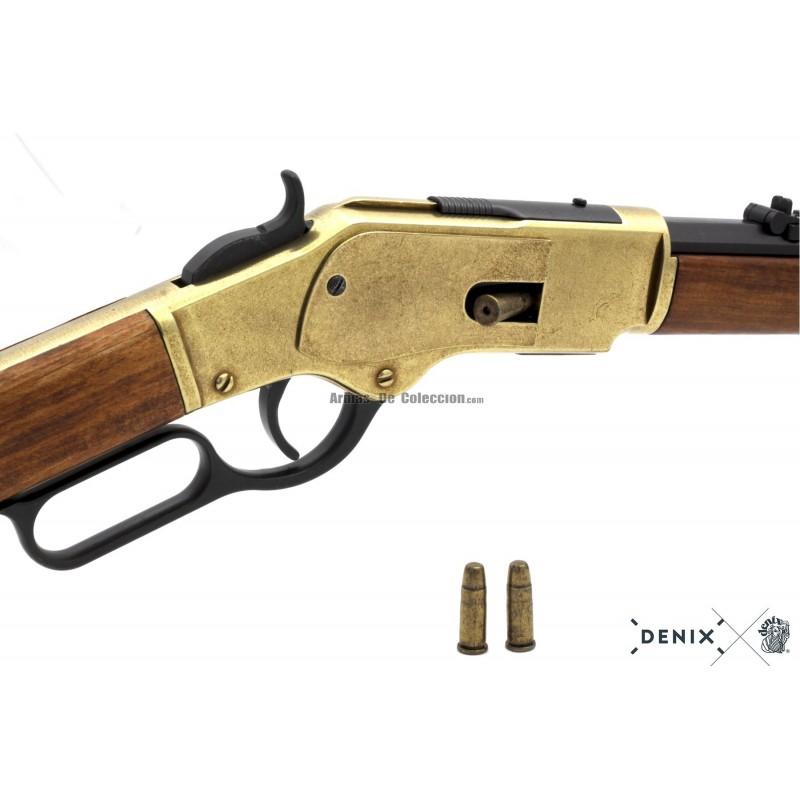 Criado a partir do rifle "Henry", em 1866, este Winchester Lever-action entrou para a história como "A Arma que Conquistou o Oeste". Sua moldura dourada única rendeu-lhe o apelido entre as tribos indígenas de "O Garoto Amarelo" (The Yellow Boy). De 1866 a 1998, 170.000 peças foram fabricadas na fábrica Winchester em Connecticut. Esta arma disparava um calibre 44 carregado pelo receptor lateral.